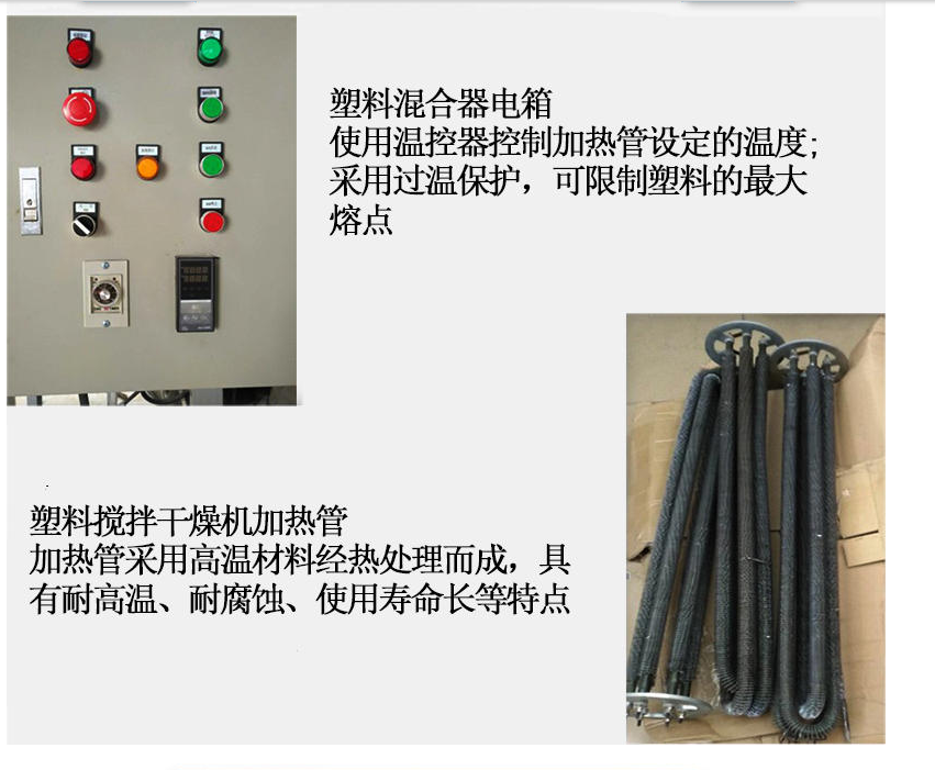 9、由于原料在桶内不停的翻滚,热风不停的从中心输送从而达到混合与干燥的同步进行,节省时间和能源。如不需干燥,只要关掉干燥开关,仅使用混合机功能,本机亦适用于粒料与粉碎料、色母粒的混合。